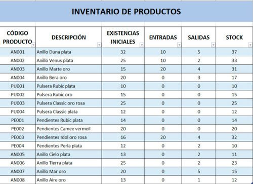 Tabla con datos de los diferentes articulos